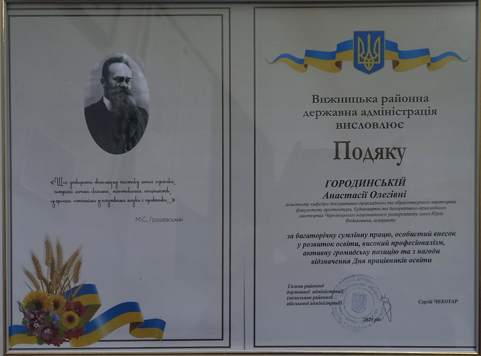 2022-2023 Чернівецький національний університет імені Юрія Федьковича, факультет архітектури, будівництва та декоративно-прикладного мистецтва, спеціальність Образотворче мистецтво, декоративне мистецтво, реставрація, відділ "Художньої обробки металу" (ковальство), магістр, денна форма навчання (диплом з відзнакою);